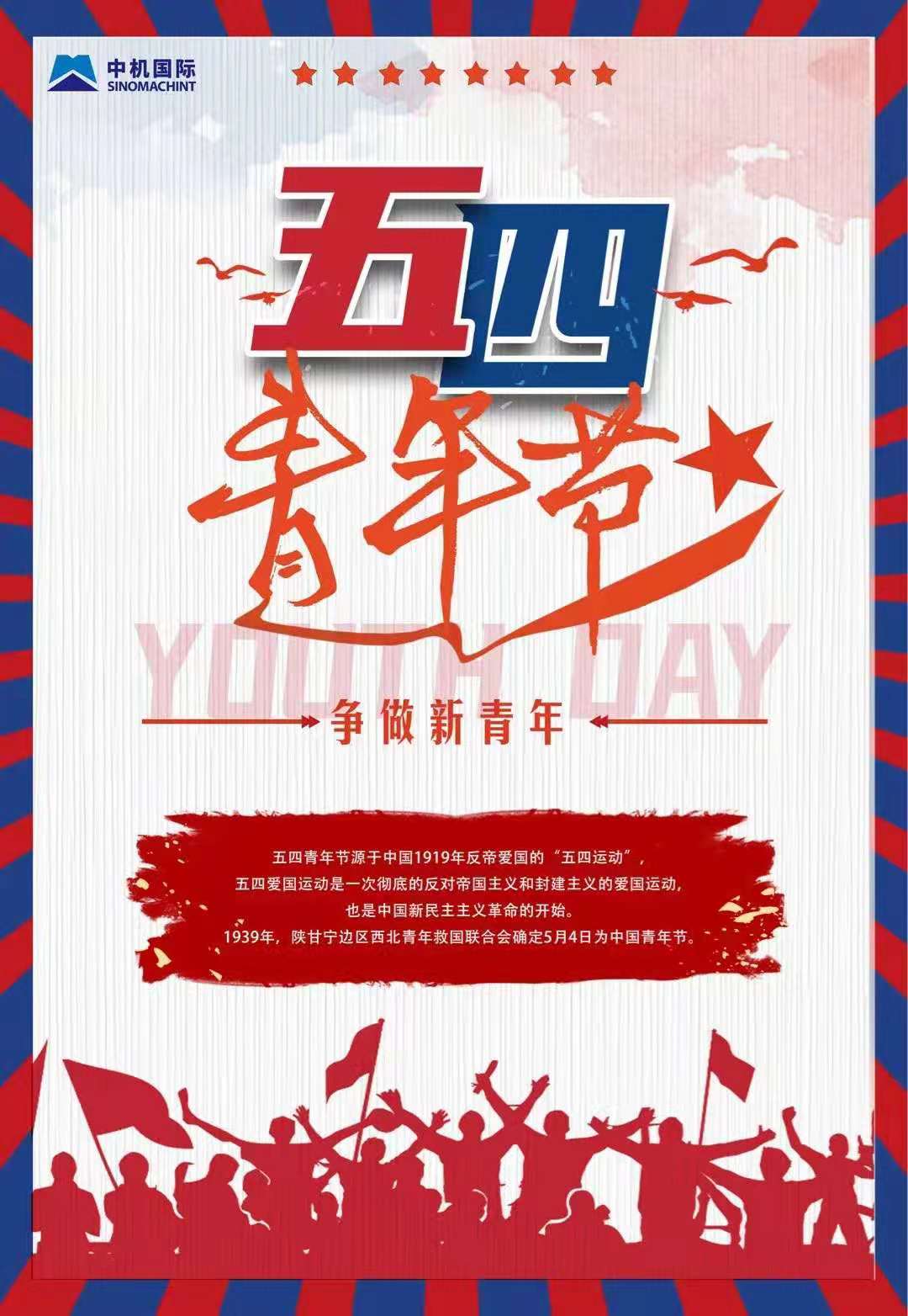 青春五月,生機(jī)盎然。值此五四青年節(jié)之際,我代表公司黨委向中機(jī)國(guó)際全體青年朋友致以節(jié)日的祝賀!向廣大共青團(tuán)員、各級(jí)共青團(tuán)干部和青年工作者致以親切的問(wèn)候!